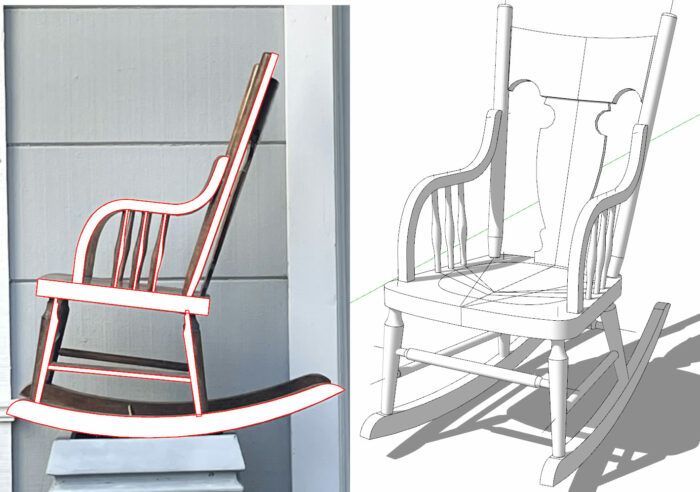 Predominantemente, minhas fontes para reprodução de móveis são fotos. Na maioria das vezes encontro essas fotos em livros e sites de museus. Ocasionalmente, as fotos são de marceneiros usando iPhones ou equivalentes. Recentemente, um de meus alunos me enviou várias fotos de uma cadeira de balanço infantil. Esta era uma herança de família e o aluno estava ansioso para iniciar uma reprodução. No entanto, cadeiras de balanço são difíceis, com muitos componentes moldados e torneados conectados em ângulos irregulares. Então me pediram para criar o modelo do SketchUp com suas cenas detalhadas, dimensionadas e anotadas, incluindo modelos em tamanho real.
